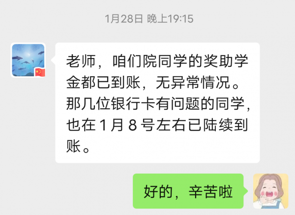 经过逐层自查,牧医工程学院秋季学期资助金额全部发放到账,不落一人,资助金额全部用于学生学习、生活,未出现任何截留、挪用、班级平分、提取班费等不符合国家规定的情况。(牧医工程学院)
