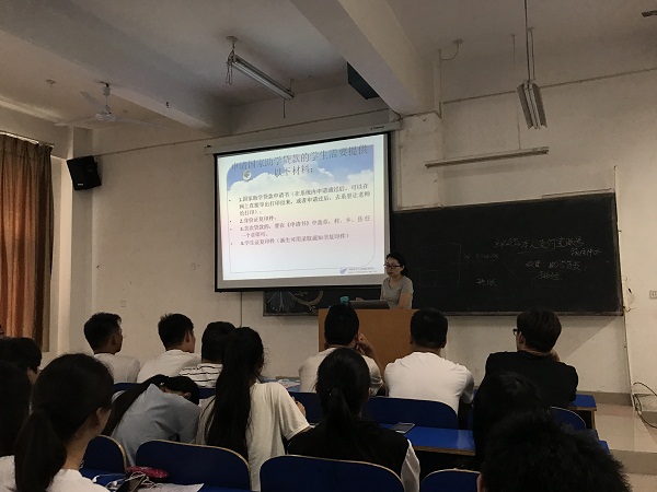 李洵老师介绍了同学们可享受的各种国家资助政策,随后就国家校园地与生源地助学贷款的申请、签约、还款流程等事宜作了详细解说,在最后的答疑互动环节,李老师针对同学们提出的各种手续疑问作了详细解答。
