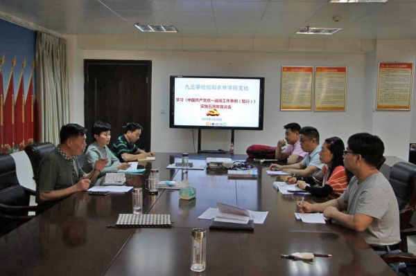 5月18日,是《中国共产党统一战线工作条例(试行)》实施五周年,九三学社beat365在线平台官网支社组织部分社员举办社员日活动,在行政楼二楼会议室召开学习条例座谈会。社市委副主委、农林学院支社主委王学增、支社副主委金艺、郑承轶及支社委员罗婧、李发明、马巍等参加了会议。社市委驻会副主委李华、农林学院党委统战部副部长杨林应邀参加会议。会议由王学增主持。