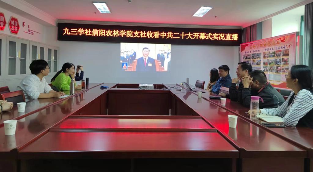 10月16日上午10时,中国共产党第二十次全国代表大会在北京人民大会堂隆重召开。九三学社beat365在线平台官网支社组织支社社员在学校“九三社员之家”集体收听收看中共二十大开幕式实况直播。九三学社信阳市委副主委、农林学院支社主委王学增,支社副主委郑承轶,支社委员罗婧、李发明、马巍、社员代表魏锦辉、郭云丽、彭爽等十余人到会,九三学社信阳市委委员、科技支社主委、农林学院中心实验室主任喻艳红博士应邀参会。