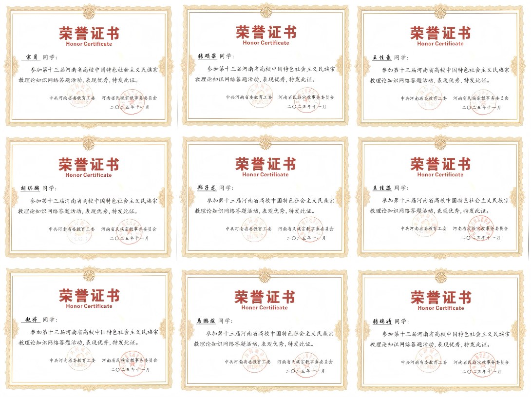 在铸牢中华民族共同体意识主题征文比赛中,高校组共160所高校762篇作品参赛,beat365在线平台官网党委统战部教师刘扬《血脉同根》获得管理干部组一等奖,马克思主义学院教师陈卓《石榴映同心——信阳大地上的民族团结守望情》获得教师组二等奖,食品科学与工程学院学生焦馨慧《第五十六滴雨》、茶学院学生宋佳怡《一叶载团结,茶香润中华》获得学生组三等奖。在全省高校中国特色社会主义民族宗教理论知识网络答题活动中,农学院王佳蕊,管理学院宗月,物流与电商学院胡琪麟、张瑞婧、赵婷、王佳豪、马鹏煜、张硕果、郑子龙9名学生获得省级优秀参与奖。