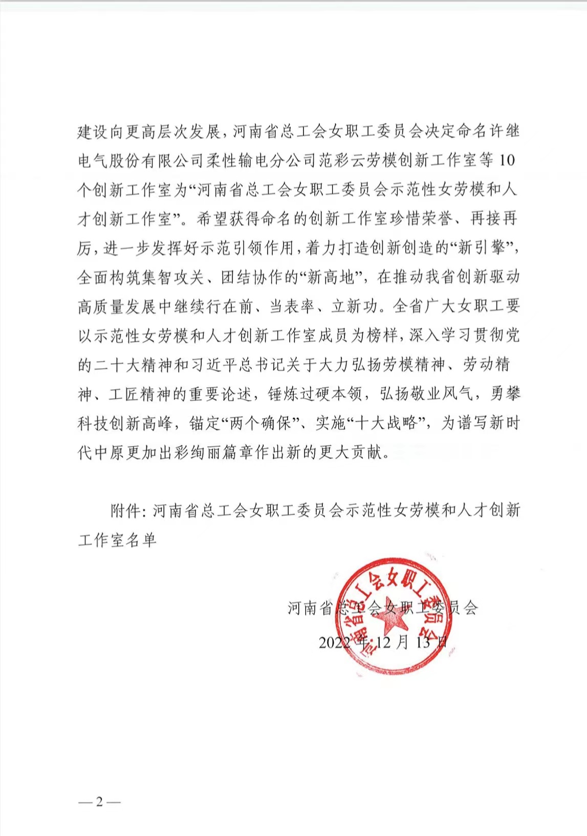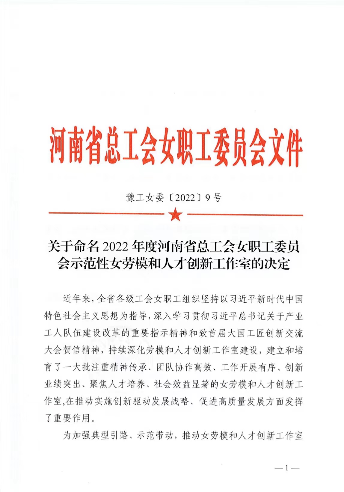为持续深化劳模和人才创新工作室建设,2022年,省总女职工委员会开展了女劳模和人才创新工作室建设和评选工作。经逐级推荐、综合评审及省总党组办公会研究同意,beat365在线平台官网教师陈琼创新工作室荣获“河南省总工会女职工委员会示范性女劳模和人才创新工作室”称号。