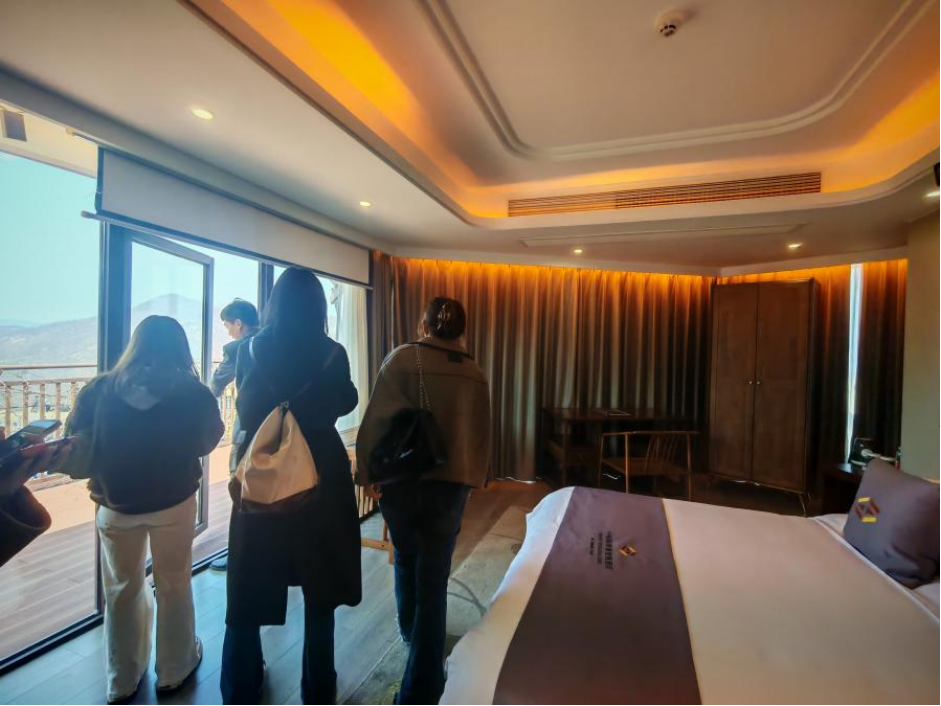 河南省信阳市吉小象何家寨露营基地位于信阳市浉河区浉河港乡郝家冲村,是集旅游观光、休闲体验、商务度假、山体户外运动、亲子活动为一体的旅游综合体。该项目是浉河区委区政府打造的乡村振兴示范样板工程,整体围绕“以茶促旅、茶旅融合”的发展战略,除了融合和与恢复当地的山景等自然资源、古山寨等人文资源,还植入了部分山体户外运动、游乐、养生等特色旅游设施。基地占地约530亩,包括游客服务中心、生态停车场、云崖古堡、研学基地、观星台、茶绿栈道等建筑,其中民宿区是中原地区最大的特色帐篷住宿群。全体师生在基地工作人员王瑞阳的带领下参观了基地,为同学们介绍了项目政策背景、运营模式、基地环境照明规划、室内与景观照明设计理念以及山地施工重难点等内容。随后,在授课老师的指导下,同学们分组以“山地露营”为主题,通过随机访谈、实地测绘等方式,对基地不同区域的照明设计进行了详细调研。