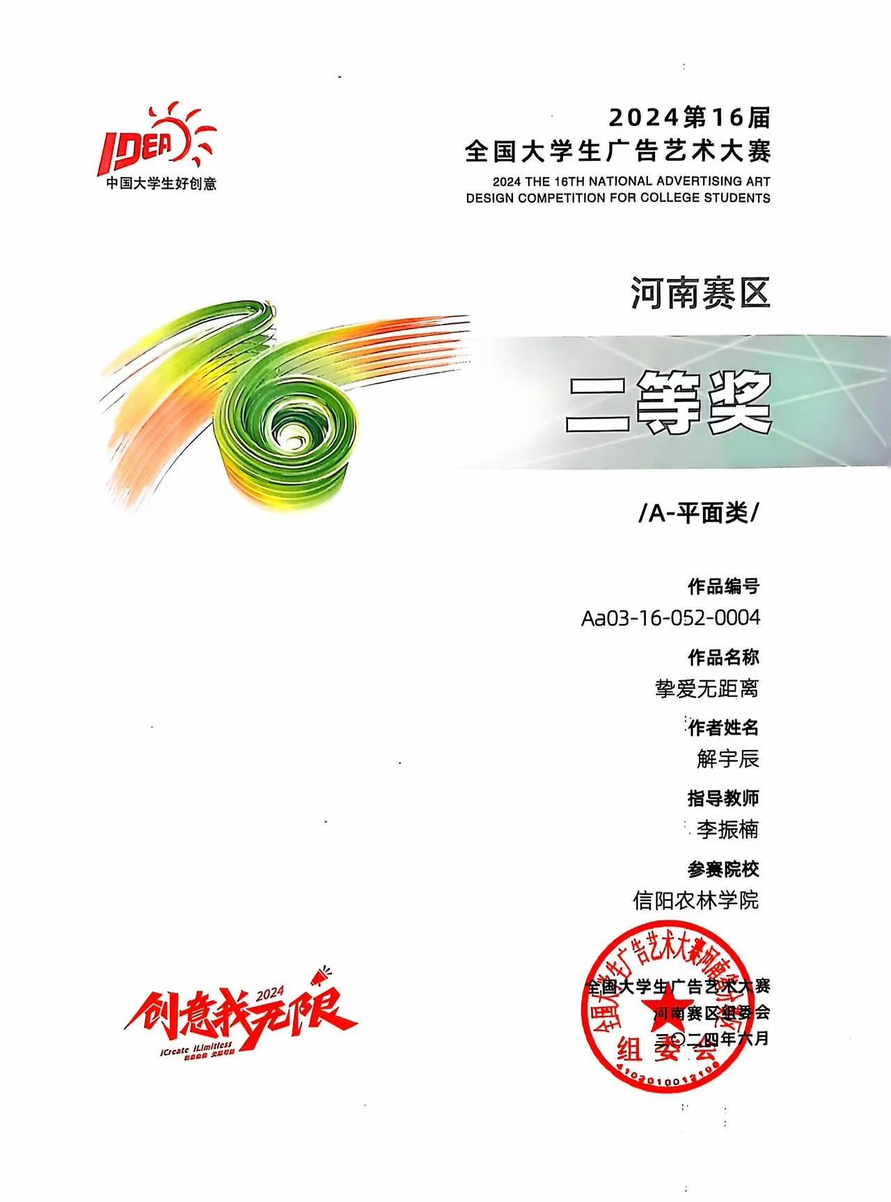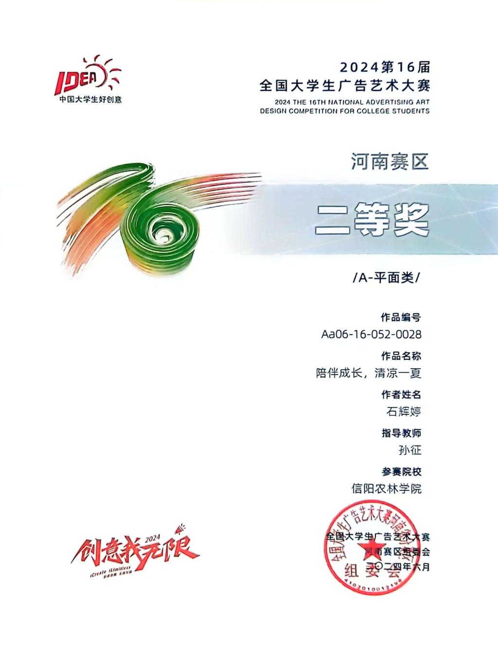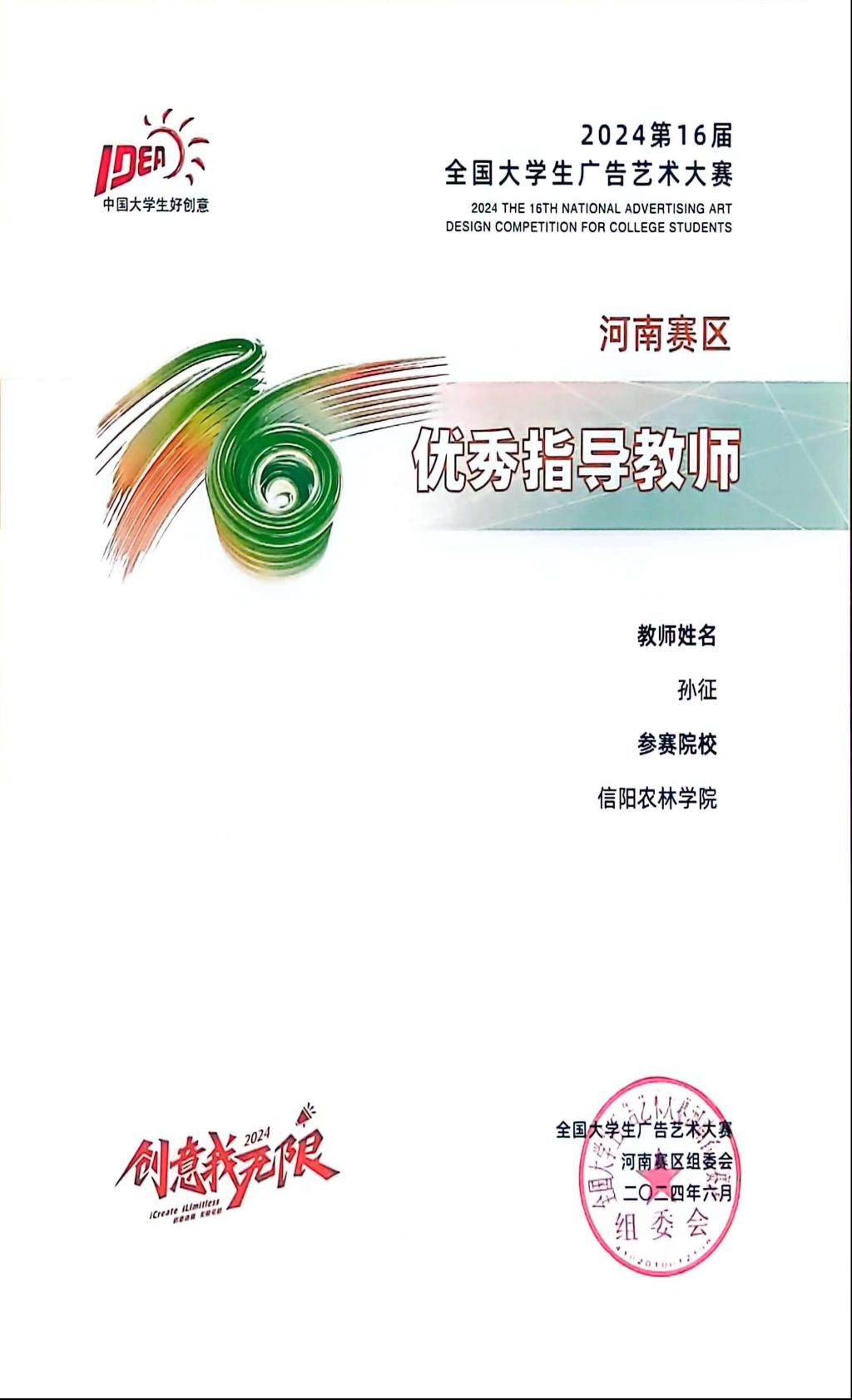 第十六届全国大学生广告艺术大赛获奖名单揭晓,我院视觉传达教研室教师孙征、徐珊珊、李振楠指导的21级、22级视觉传达设计专业的解宇辰、石辉婷、马昱睿、王珊珊的设计作品荣获河南赛区二等奖和三等奖,孙征、李振楠荣获优秀指导教师奖。