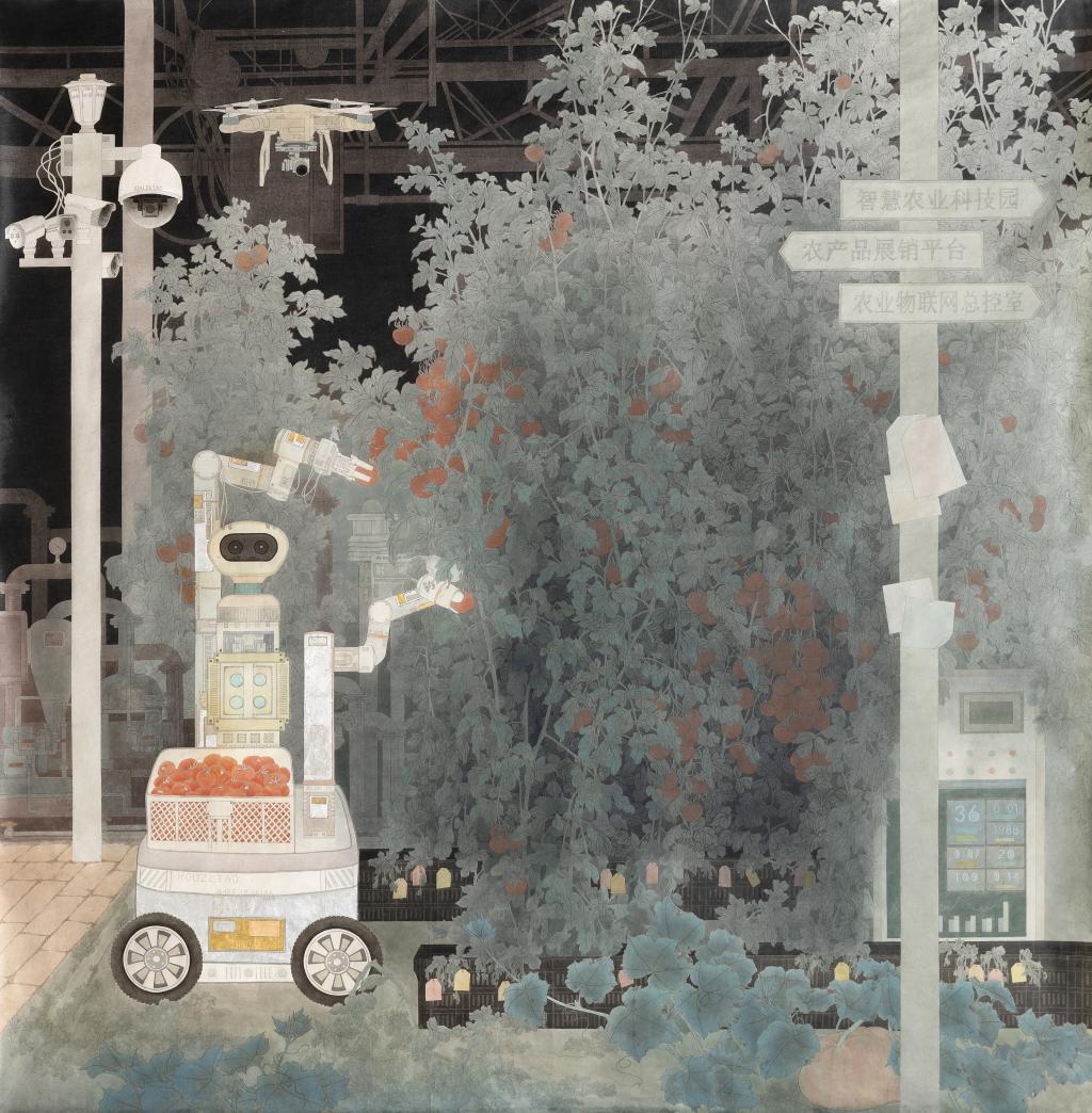 侯泽涛师在研讨会上就本次的参展作品《科技兴农逐梦时》进行了详细解说,他表示本次作品主要是从现代农业的角度,用工笔画学的表现手法完成的一幅作品,着重表现科技力量在农业领域给人们带来的一些惊喜与感悟。农业是立国之本,强国之基,河南也是农业大省,大力发展现代农业是解决三农问题的必由之路。因在beat365在线平台官网工作多年,“三农”题材作品是我们青年画家乐于表现的创作元素,现代科技已经完全走入了我们的生活,也引领着时代的发展,为我们的生活带来了很多的便利。现代农业,也是未来农业的发展趋势,作为一名美术从业者,我们应该大力发掘农业题材作品,以画笔为工具,以艺术作品为载体,描绘现代农业图景,谱写新时代乡村全面振兴新篇章。(撰稿/侯泽涛 摄影/乔翔)