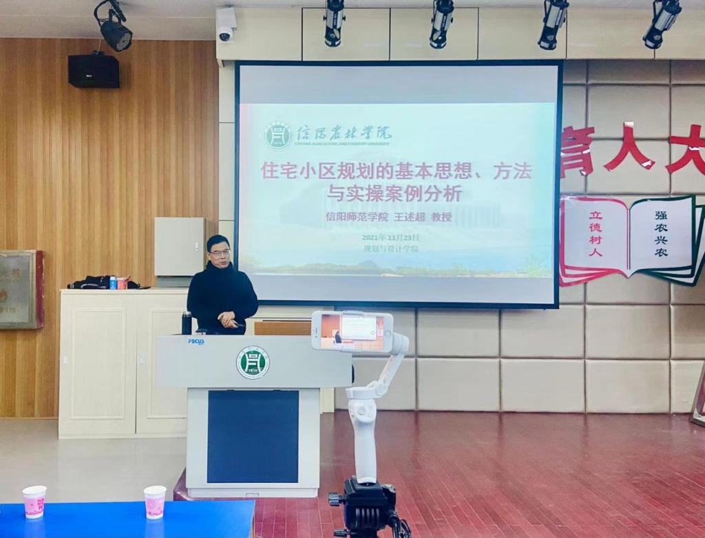 11月23日,规划与设计学院邀请了信阳师范学院王述超教授在一教E101作了题为《住宅小区规划的基本思想、方法与实操案例分析》的学术报告,报告采用线上线下同步直播方式进行,规划与设计学院城乡规划专业、风景园林专业全体师生参加了报告会。