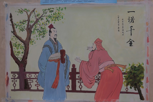 作品简介: “一诺千金”出处于西汉·司马迁《史记·季布栾布列传》:“得黄金百斤,不如得季布一诺。”“一诺千金”体现了贤人君子的高风亮节,人无虚言才赢得信用,足见诺言的重要。