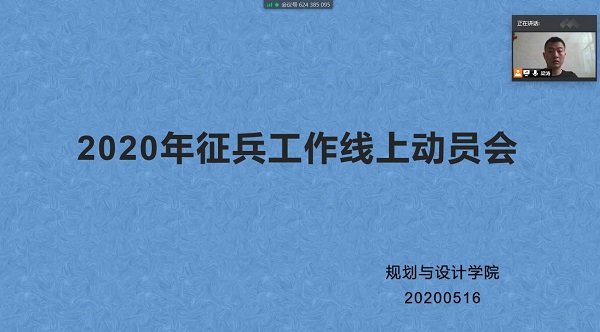 为进一步增强广大师生的国防观念和国家安全意识,普及国防知识,积极引导大学生参军入伍,全面推动规划与设计学院2020年征兵工作的开展。学院成立以党总支书记张奔书记为组长,学院专职辅导员为成员的征兵工作领导小组,规划与设计学院在线上组织进行了国防教育专题报告暨征兵政策宣传月启动仪式,各班级辅导员陆续召开征兵政策宣传的线上主题班会,落实征兵政策进班。
