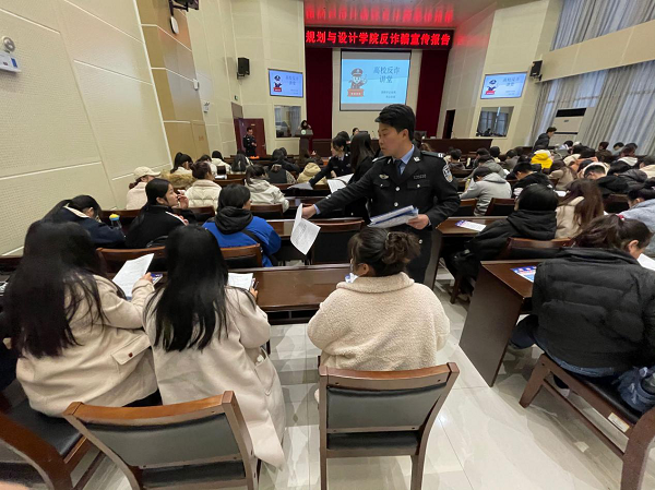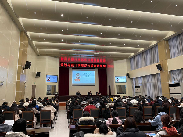 为加强学生的安全防范意识,切实保护学生免受财产及人身侵害,规划与设计学院11月25日在图书馆六楼报告厅邀请信阳市公安局羊山分局民警为我院学生开展反诈骗宣传报告。