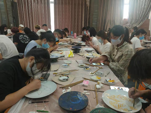 在10月16日,文明示范班到江西景德镇的陶溪川、雕塑瓷厂、古县衙等地展开考察,让示范班同学们感受景德镇浓厚的陶瓷文化氛围。10月17日,文明示范班进行画瓷盘活动,期间,由专业老师对文明示范班学生进行画瓷盘绘画技法的讲解和绘画实操步骤的演示,文明示范班同学们皆兴致勃勃的积极参与画瓷盘活动中,他们根据自身对传统文化的理解,将荷花、梅、兰、竹、菊、鸟、鱼等大自然的事物通过绘画的表现形式艺术性的描绘在陶器瓷盘上,赋予瓷器独特的美好寓意,使同学们真切的体验了中国传统陶瓷文化的艺术魅力。