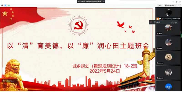 为深入贯彻落实全国高校思想政治工作会议精神,帮助毕业生系好人生“第一粒扣子”,规划与设计学院各毕业班辅导员采取线上线下相结合的方式,于2022年5月24日纷纷召开“以‘清’育美德,以‘廉’润心田”2022届毕业生廉洁教育主题班会。