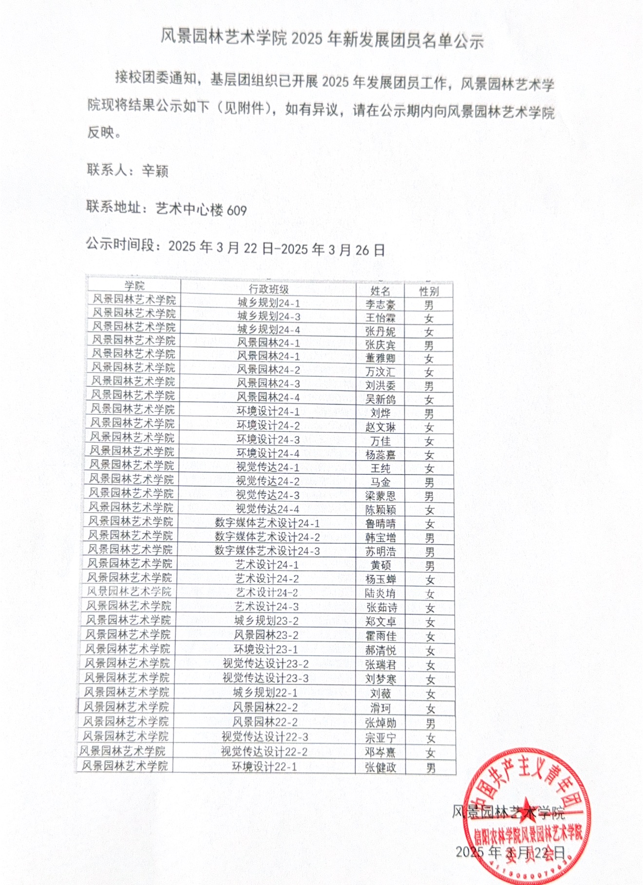接校团委通知,基层团组织已开展2025年春夏发展团员工作,风景园林艺术学院现将结果公示如下,如有异议,请在公示期内向风景园林艺术学院反映。