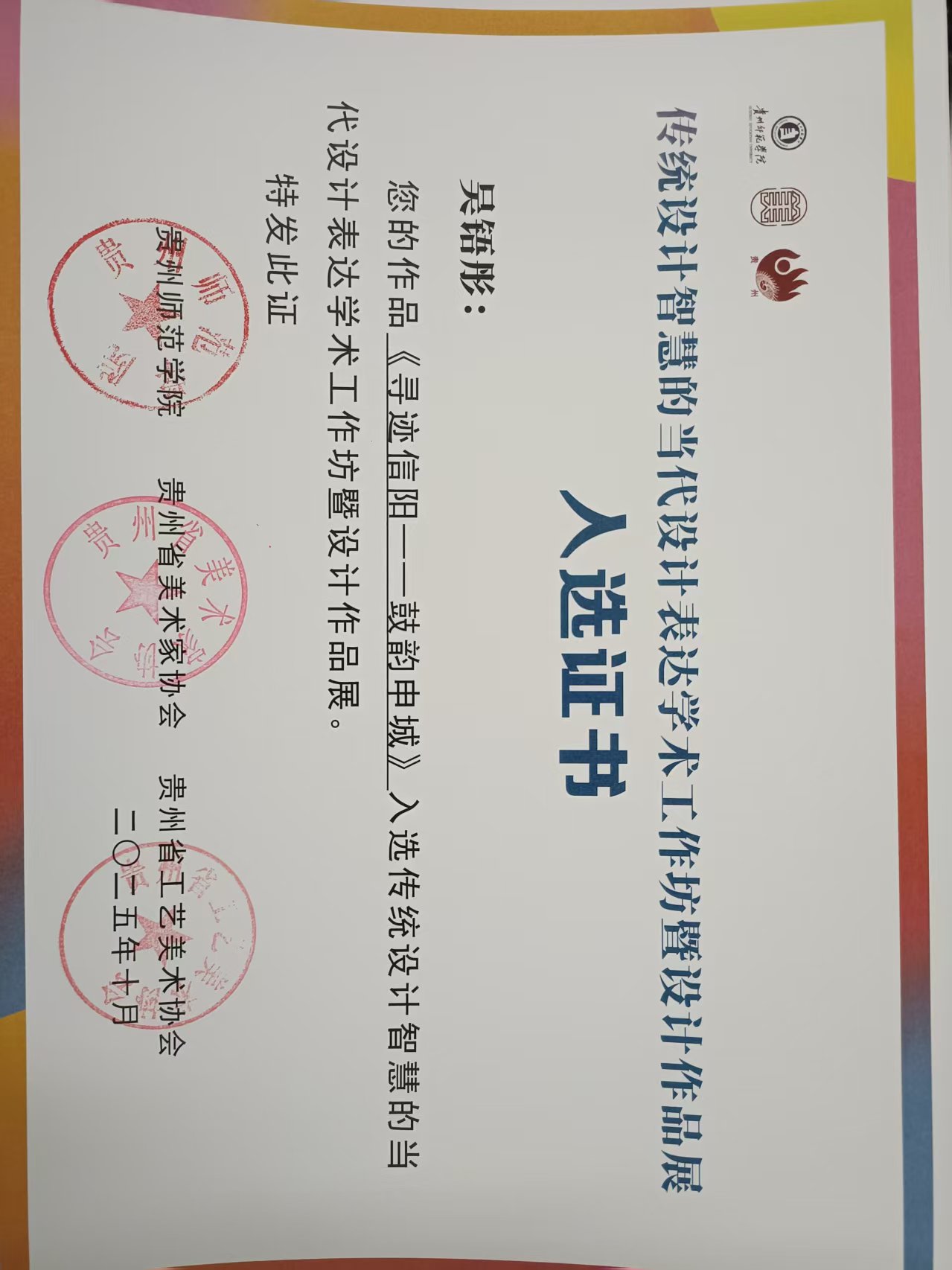 近日,由贵州省美术家协会、贵州省工艺美术协会、贵州师范学院联合主办的“传统设计智慧的当代设计表达学术工作坊暨设计作品展”入选结果揭晓,我院吴铻彤(指导教师:陈美序)、许毓菡(指导教师:康莉)、韩晓冉(指导教师:刘鸣鸣)、史奇玉(指导教师:刘昂)四位同学的作品凭借对传统设计智慧的创新诠释成功入选,充分展现了beat365在线平台官网在设计专业教学与实践中的卓越成果。 此次作品入选,是对我院人才培养成效的有力肯定。我院始...