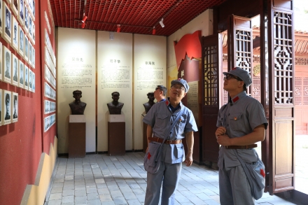 全体党员佩戴党员徽章,身穿红军服,首先在政治文化广场上整齐肃立,深切缅怀革命先烈,在组织员葛晖的带领下,面对鲜红的党旗重温入党誓词,铮铮誓言,表达出共产党人的理想信念和革命情怀。在参观教育活动中,党员们先后参观红二十五军军部旧址何氏祠、红二十五军烈士纪念碑、红军碾、红二十五军长征出发地标志物银杏树。在参观中,一张张珍贵的革命历史照片,一处处呈现历史背景的展区,再现当年革命先烈浴血奋战的激烈场面,让全体党员真切感受到革命先驱和烈士们的赤胆忠心、铮铮铁骨的浩然正气。大家在一幅幅图片和一件件实物前所驻足观看,深切体会共产党人和广大人民群众同舟共济,军民一心,复兴中华的伟大精神。