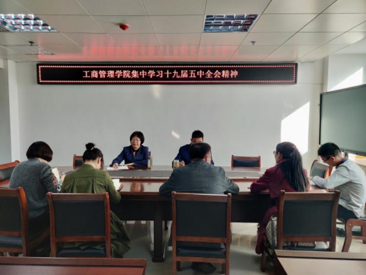 2019年11月12日下午,工商管理学院党总支召开习中心组集中(扩大)专题学习会,深入学习贯彻党的十九届五中全会精神。院中心组成员及各支部书记参加学习会,会议由院党总支书记蔡志主持。