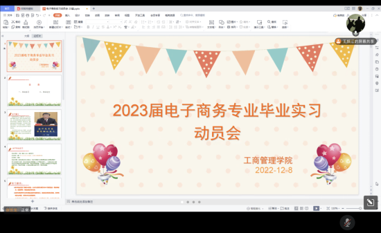 为破解就业难题,消除毕业生在就业、择业中的困惑,进一步帮助同学们树立正确的就业观和择业观,使广大学生了解就业形势、就业政策,转变就业观念,提高就业技能,2022年12月8日下午,电子商务专业在腾讯会议召开了2023届本科毕业生毕业实习动员会。会议由电子商务教研室王振江老师主持。