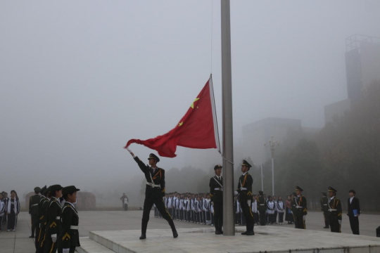 早上7时整,英姿飒爽的国旗护卫队队员迈着铿锵有力的步伐,护送五星红旗步入升旗台。伴随着雄壮激昂的国歌声,鲜艳的五星红旗迎着朝阳冉冉升起。全体师生肃穆站立,齐唱国歌,向国旗致以最崇高的敬意。