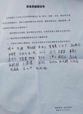 2018年11月9日是我国第28个消防日,为提升学生的安全消防意识,工商管理学院文明示范班于11月25日在校园内开展了以“全民参与,防止火灾”为主题的志愿活动,本次活动主要有两个部分,一是开展消防安全主题班会,学习相关消防知识。二是全班同学签安全责任承诺书。