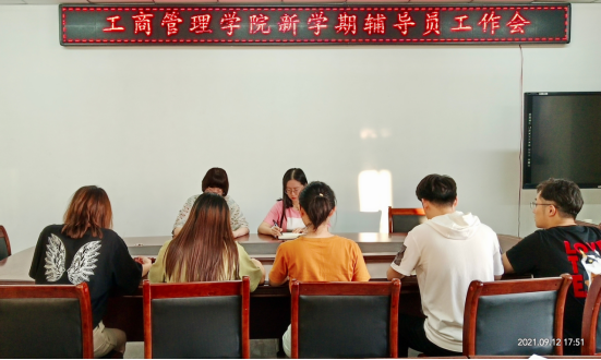 2021年9月12日下午,工商管理学院召开新学期辅导员工作会,本次会议由院党总支副书记王宇平主持,学院专兼职辅导员参加会议。