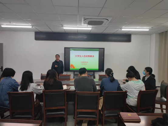 有国才有家,军营是报效祖国的阵地,也是人才成长的沃土。在第七个全民国家安全教育日到来之际,为了增强学生的国家安全意识和法治意识,宣传大学生参军入伍政策,推动2022年大学生征兵工作,工商管理学院组织全体辅导员学习了2022年全民国家安全教育日主题和入伍政策,全体学生以腾讯会议的方式收听,由学院武装专员范嘉义主讲。
