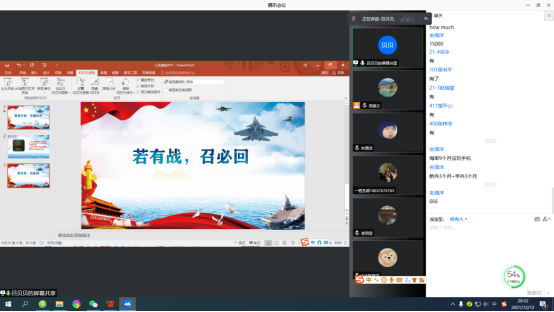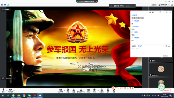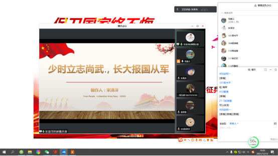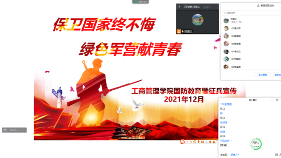 为了增强大学生国防安全意识,营造参军入伍的氛围,工商管理学院于2021年12月12日通过腾讯会议开展了国防教育和征兵宣传,本次报告由武装专员范嘉义主持,退伍复学大学生士兵吕贝贝、朱海洋、宋泽洋及2021级全体学生参加。