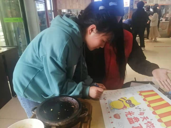 活动期间,志愿者积极向前来就餐的同学宣传“光盘行动”,提醒同学们珍惜粮食,做到不铺张不浪费,践行“一粥一饭,当思来之不易;半丝半缕,恒念物力维艰。”同学们积极响应,纷纷用行动做到“光盘”,并在宣传画中签上自己名字。与此同时,学院还贴心为践行“光盘行动”的同学准备精美小礼品,激励同学们坚持“光盘行动”。