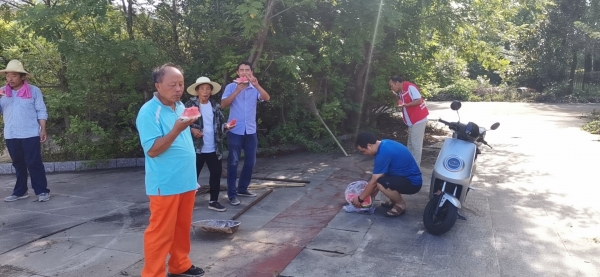 8月15日上午,后勤党总支书记李友国带领分管副处长(副总经理)张宇航、厉相卿一行三人至浉河校区检查创建文明城市环境整治情况。为创建信阳市文明城市,后勤物业管理中心及水电维修中心组织人员已连续多天在浉河校区进行环境整治作业。天气炎热,李书记给大家送去了西瓜、矿泉水等清凉解暑的物资,要求工作人员在注意好防暑降温的同时开展好创文工作。(王道大)
