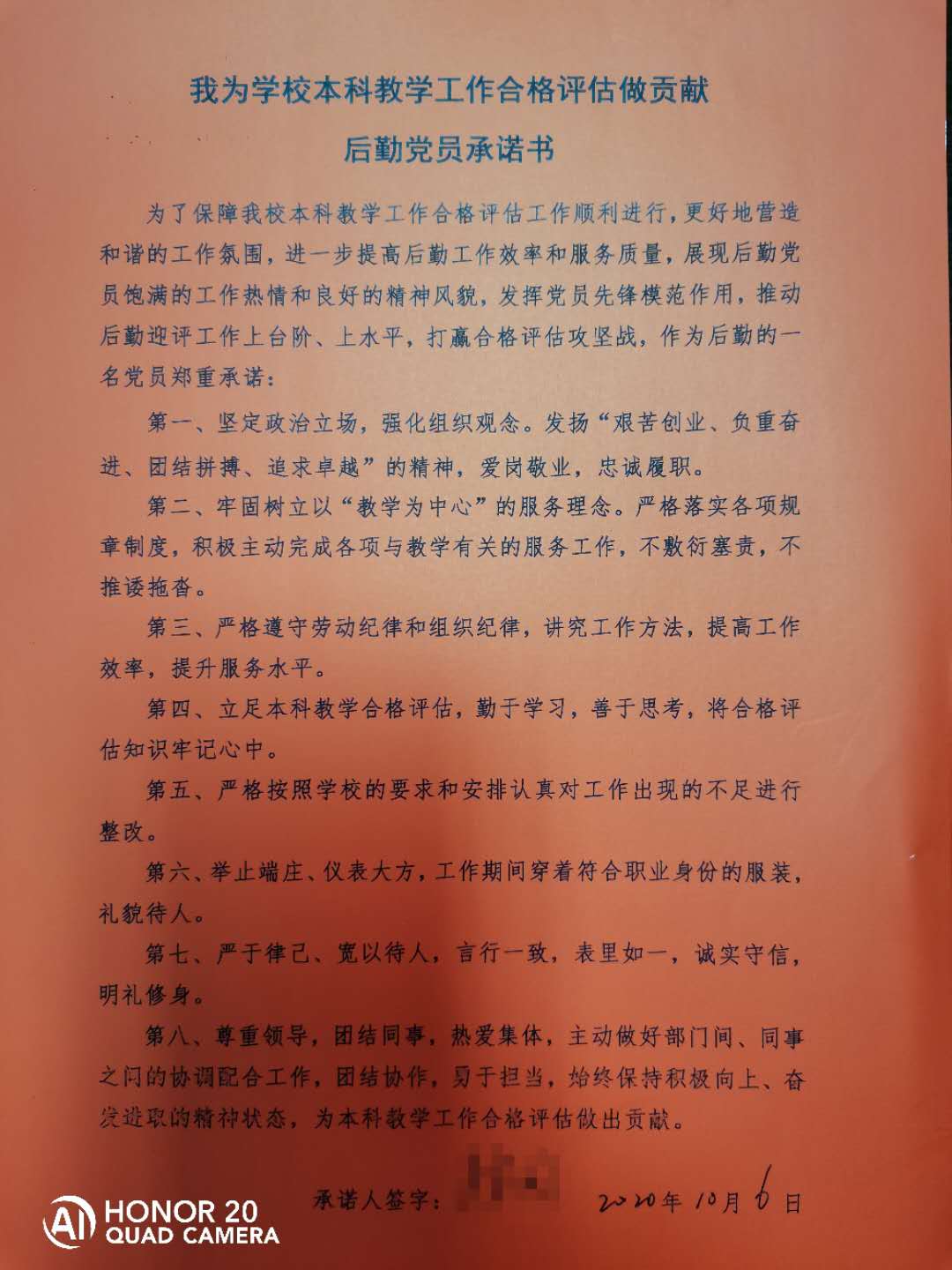 会后后勤第一党支部全体党员干部签署了“我为学校本科教学工作合格评估做贡献后勤党员承诺书”。