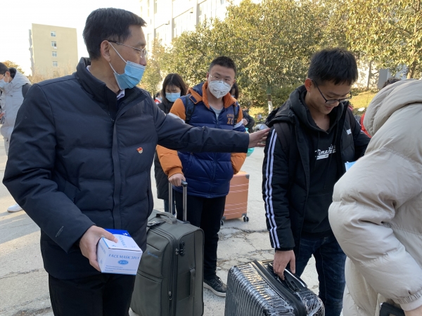 李友国书记亲自为回家心切的学子们发放口罩,并嘱咐同学们回家路上戴好口罩做好个人防护,路上看好自己的行李物品一定要注意安全,祝同学们新年快乐。先锋队的党员们认真仔细的为车辆消毒消杀保障乘车安全,维持上车秩序,为同学们搬运行李。看着同学们乘车离开,部分党员同志们又回到各自的岗位为全校师生做好后勤保障服务。