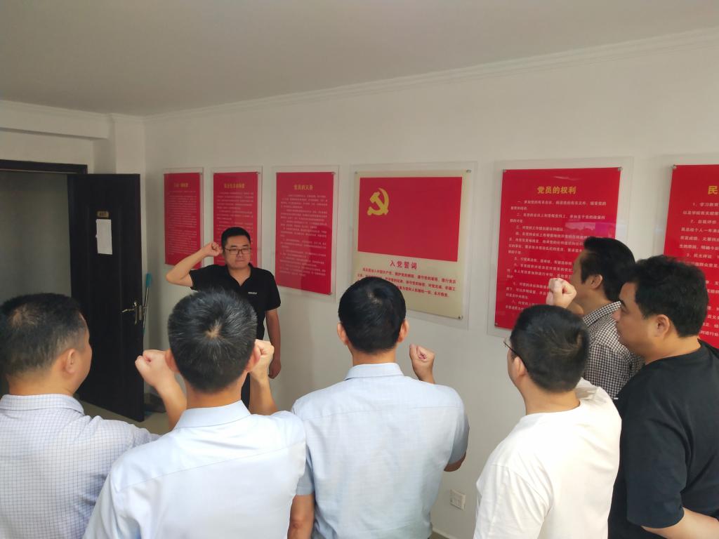 我志愿加入中国共产党……随时准备为党和人民牺牲一切,永不叛党。”党员在后勤第一党支部书记的带领下,面对鲜红的党旗和庄严的誓词,共同高举右拳,庄严宣誓。铿锵有力的宣誓,表达了大家对党的无限忠诚、热爱和听党话、跟党走的坚定决心。