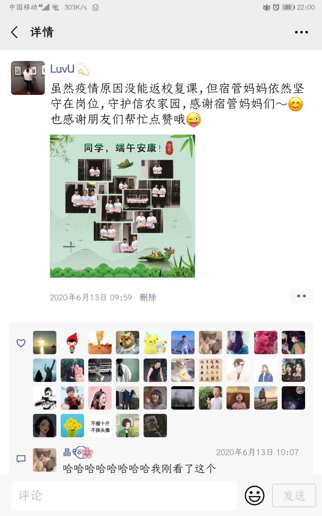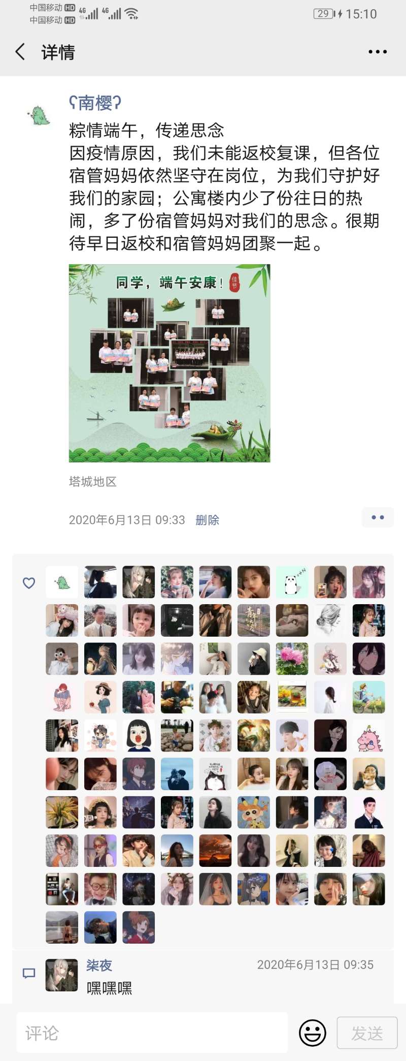 在端午佳节即将来临之际,因疫情原因,学生未能返校复课,公寓内少了往日的热闹,为表达宿管妈妈们对同学们的思念,后勤公寓管理与服务中心开展了“粽情端午,传递思念”活动。活动一开始就在学生中引起强烈的反应,第一天便有上千名学生参加活动,纷纷在朋友圈中纷纷表达自己对宿管妈妈们的思想,截至6月18日活动结束,参加活动的同学已经有近1万余人,各朋友圈点赞量累积近2.5万,获得了学生和家长的一致好评,目前宿管妈妈们为学生们准备的爱心粽子和鸭蛋正陆续通过邮政快递寄往学生们的手中。