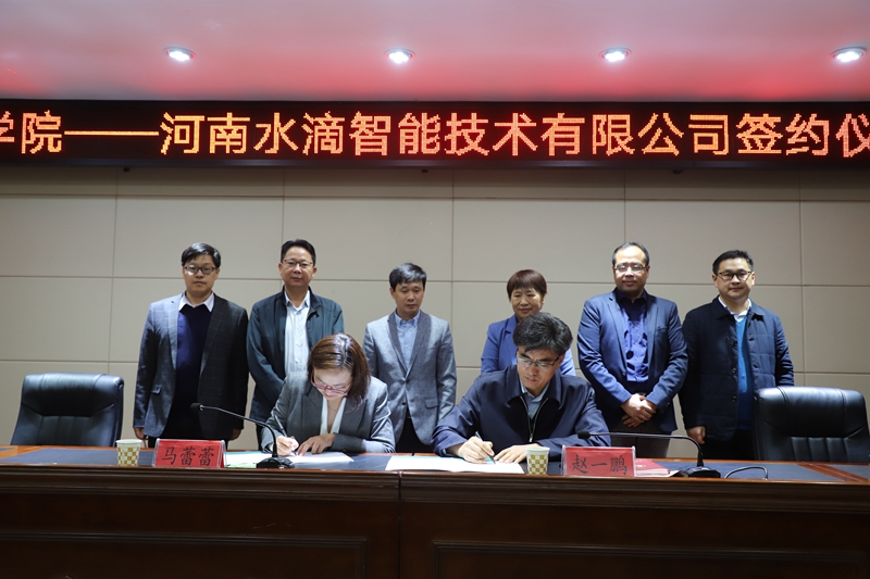 签约仪式上,赵一鹏首先致欢迎词,简要介绍了学校的基本情况,以及学校在落实实践教学、应用型人才培养方面所做的具体工作。他要求信息工程学院全体师生在人工智能、智能机器人等领域与河南水滴智能技术有限公司加强合作交流,通过共建校内实验、实训室,协作科研等多种方式,全面提升物联网工程等相关专业高素质应用型人才培养水平。随后,赵一鹏和马蕾蕾在校企合作协议上签字,签约仪式圆满完成。