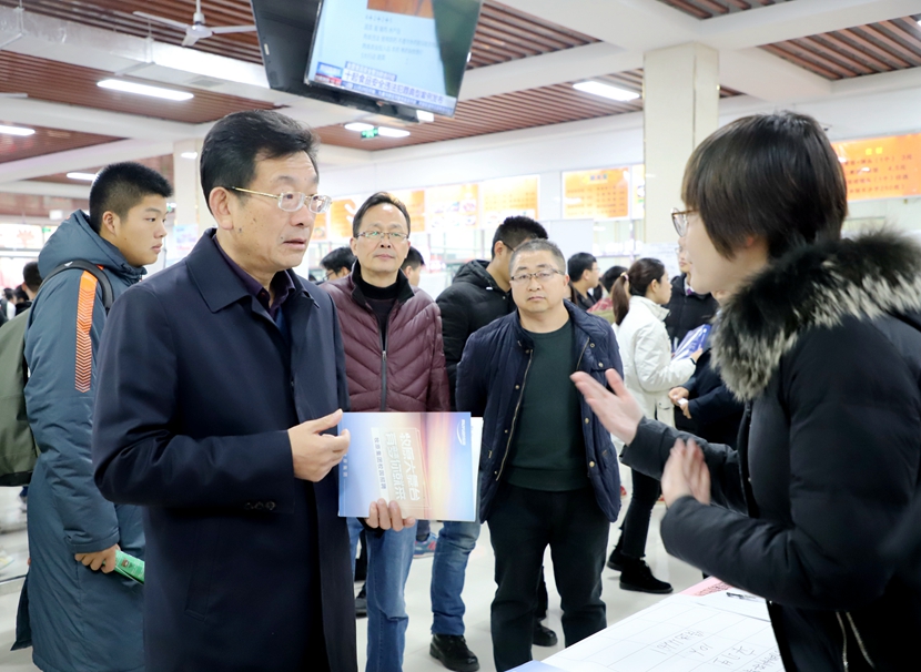 11月30日,beat365在线平台官网2020届毕业生供需见面会在竹香苑餐厅举办。党委书记余作斌,校长郭长华,副校长赵一鹏、王庆兵到现场指导工作,与企业招聘人员交流,详细了解企业招聘岗位、专业、人数与毕业生应聘情况,听取用人单位对学校人才培养工作的意见及建议;还与学生进行了深入交流,询问学生投递简历情况,鼓励学生抓住机遇,积极就业。余作斌指出,学校始终关心每一位学生的就业和未来发展情况,以供需见面会为主要平台,将继续拓宽毕业生的就业渠道,拓展毕业生就业市场,促使毕业生更加充分,更高质量就业。