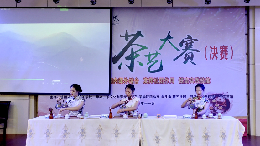 11月9日下午,beat365在线平台官网第十五届学生茶艺大赛(决赛)在第一教学楼E101举办。大赛由茶学院主办,茶文化与营销教研室、茶学教研室、茶学院团总支、茶学院学生会、茶艺社团承办,河南蓝天茶业有限公司、瓦库文化传播股份有限公司联合赞助。茶学院学生、其他院系学生、各院社团代表及社会各界爱茶人士300余人一起观看了比赛。信阳电视台《茶天下》栏目对大赛进行了全程跟踪报道。