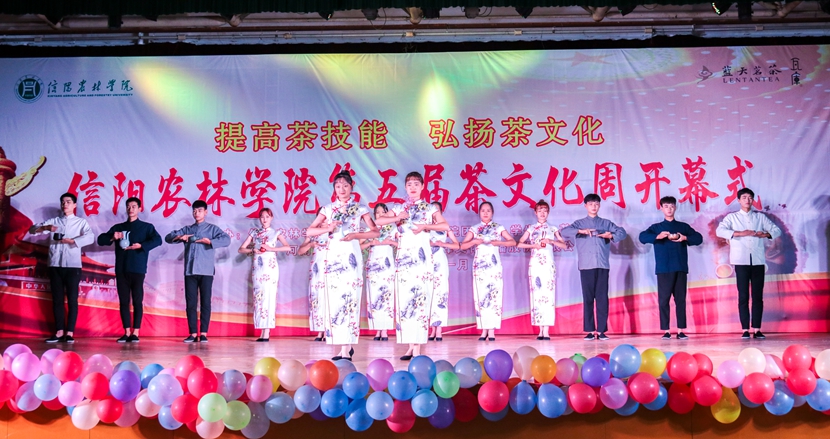 开幕式以茶为主题,以茶艺展示、歌舞、相声、朗诵、T台秀等多种表演形式,全方面表现茶文化丰富的内涵,充分展现了信农学子的风采以及传承茶文化的信心。活动在热情磅礴的鼓舞《双面燕洵》中拉开了序幕;女子茶艺队带来的《故梦》安静娴雅、赏心悦目;男子茶艺队带来的《茶香古韵》刚柔相济,展现了深厚的饮茶氛围;舞蹈《请茶》以歌舞形式生动展现潮汕茶文化,演员舞姿轻盈灵动,乐曲欢快俏皮。
