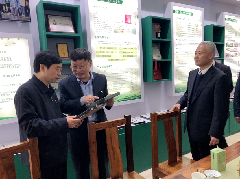 茶学院院长郭桂义教授向乔新江简要汇报了学校茶学教学、科研、技术服务等情况,展示了不同年代信阳毛尖、西湖龙井等茶叶样品标本,乔新江对陈列的不同年代的茶叶样品标本给予了高度评价。希望学校能培养出更多优秀茶叶人才,促进信阳茶产业的发展。
