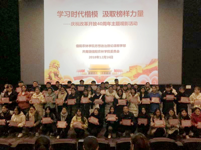 12月16日上午,思政部和校团委在恒大影城联合举办主题为“学习时代楷模,汲取榜样力量”的庆祝改革开放40周年观影活动,观看了庆祝改革开放40周年重点影片《黄大年》。思政部主任邱兴平、相关师生代表参加了本次活动。