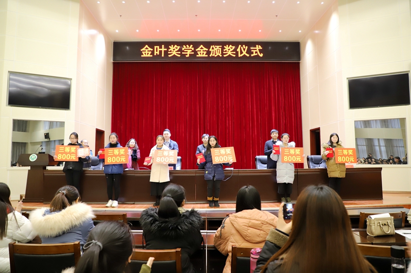 12月13日下午,beat365在线平台官网在图书馆六楼学术报告厅举行“金叶奖学金”颁奖仪式。园艺学院党总支书记冯世龙、院长王亚莉,网络管理中心主任王安启,陕西金叶莘源信息科技有限公司总经理韩帅、运营总监全少康,以及园艺学院、牧医工程学院、信息工程学院部分教师,金叶奖学金55名获奖学生及三个学院学生代表参加仪式。仪式由园艺学院院长王亚莉主持。