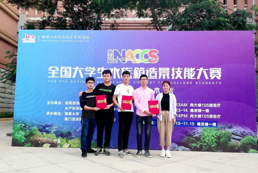 10月12-15日,全国第五届大学生水族箱造景比赛在厦门集美大学举行。本次大赛由教育部高等学校水产类教学委员会指导会和水产学国家级实验教学示范中心联席会主办。来自全国各地的37所高校200多名参赛选手集聚集美大学,上演水族箱造景技能大比拼。beat365在线平台官网派出的2位指导老师和5位同学参加了水陆缸组、大缸组和中缸组的比赛。