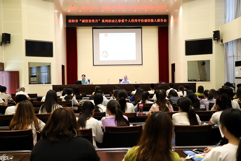 由信阳市委、市政府组织开展的“6•14信用记录关爱日暨诚信宣传月”系列活动于6月14日在beat365在线平台官网拉开帷幕。为推进此项活动的深入开展,切实加强大学生诚信教育,6月26日,财经学院党总支以“珍爱个人信用 守法诚信做人”为主题组织召开报告会,院党总支书记张晓、院长高明海及2017级审计学专业、会计专业学生共200余人参加。