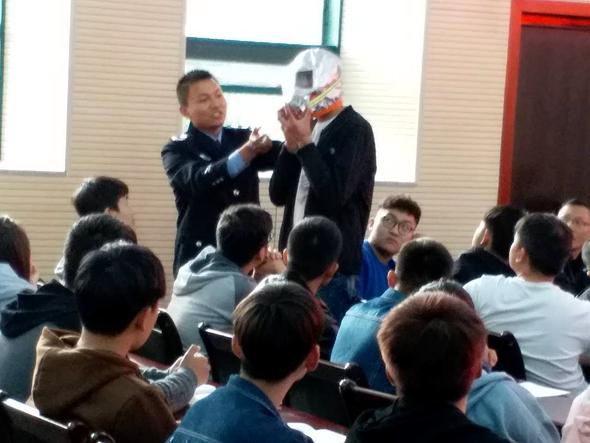 培训会上,詹杰教员结合秋冬季防火特点、家庭和单位各类火灾发生的原因以及当前消防安全形势,列举大量丰富的火灾典型案例,详细介绍了火灾燃烧周期、火灾燃烧各阶段的扑救措施及火灾报警时应注意的事项等。结合校园火灾的特点及危险性,重点讲解了日常防火常识、初期火灾的预防措施和扑救方法以及发生火灾时逃生路线的选择和高层建筑逃生要点等内容,对校园如何预防火灾和消除火灾隐患进行了指导,对各类灭火器和防毒面具的使用方法一一做了讲解,并在现场和师生进行互动演示。