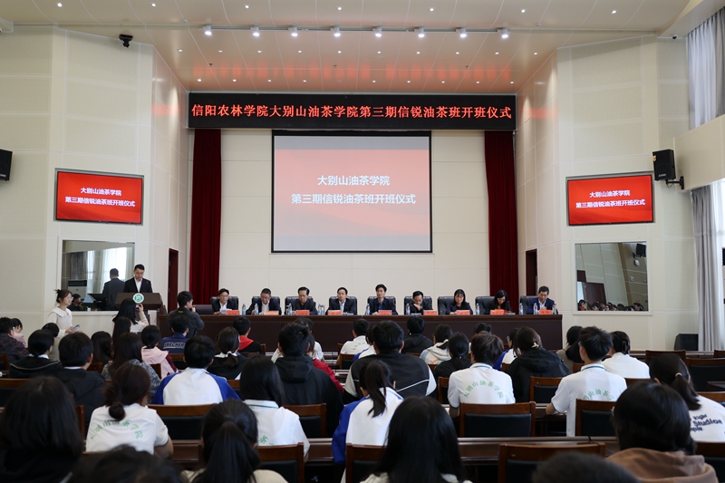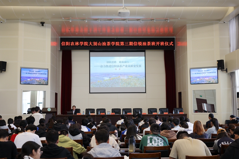 10月13日,大别山油茶学院在图书馆六楼报告厅举行第三期信锐油茶班开班仪式。信阳市政府机关党组成员、市林业和茶产业局党组成员、市油茶产业发展中心主任陈犁,副校长刘开华,市油茶产业协会秘书长陈廷森,市林科所副所长卜付军,学校相关学院、部门负责人,大别山油茶学院教师代表及第三期油茶班全体学员参加了开班仪式。开班仪式由大别山油茶学院副院长李蒙主持。