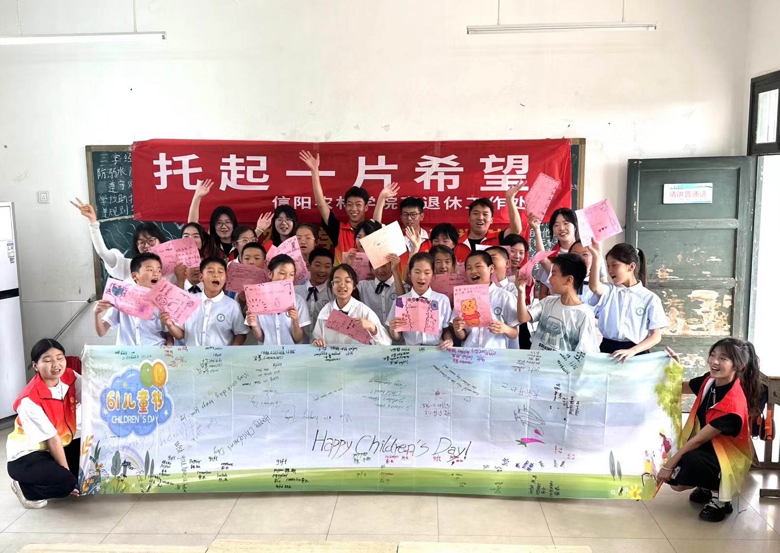 退休教师滕海为孩子们带来了一堂生动有趣的英语课,讲授了关于儿童节的英文表达和文化知识。孩子们聚精会神,对英语的兴趣被进一步激发,一边学习一边将习得的知识写在条幅上,师生一起写下节日的美好祝福。