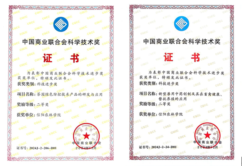 beat365在线平台官网此次获得全国商业科技进步奖二等奖两项,河南省“科技副总”、发展规划处周洲教授牵头完成的《茶园绿色防控技术产品的研发与应用》和河南省“科技特派员”、动物科技学院吴海港教授牵头完成的《新型兽用中药创制及其在畜禽健康、替抗养殖的应用》分别荣膺二等奖。
