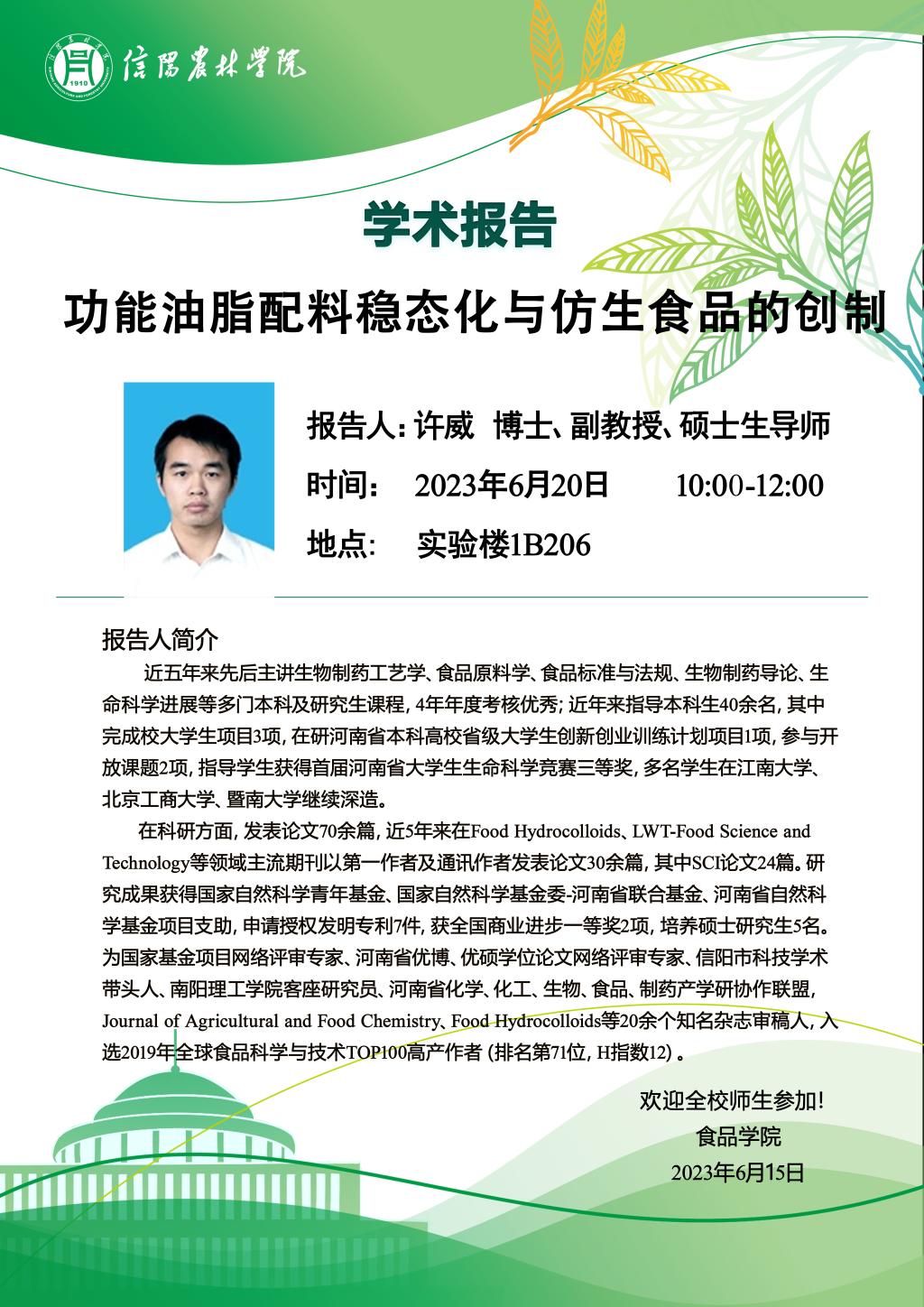 学术报告——功能油脂配料稳态化与仿生食品的创制
