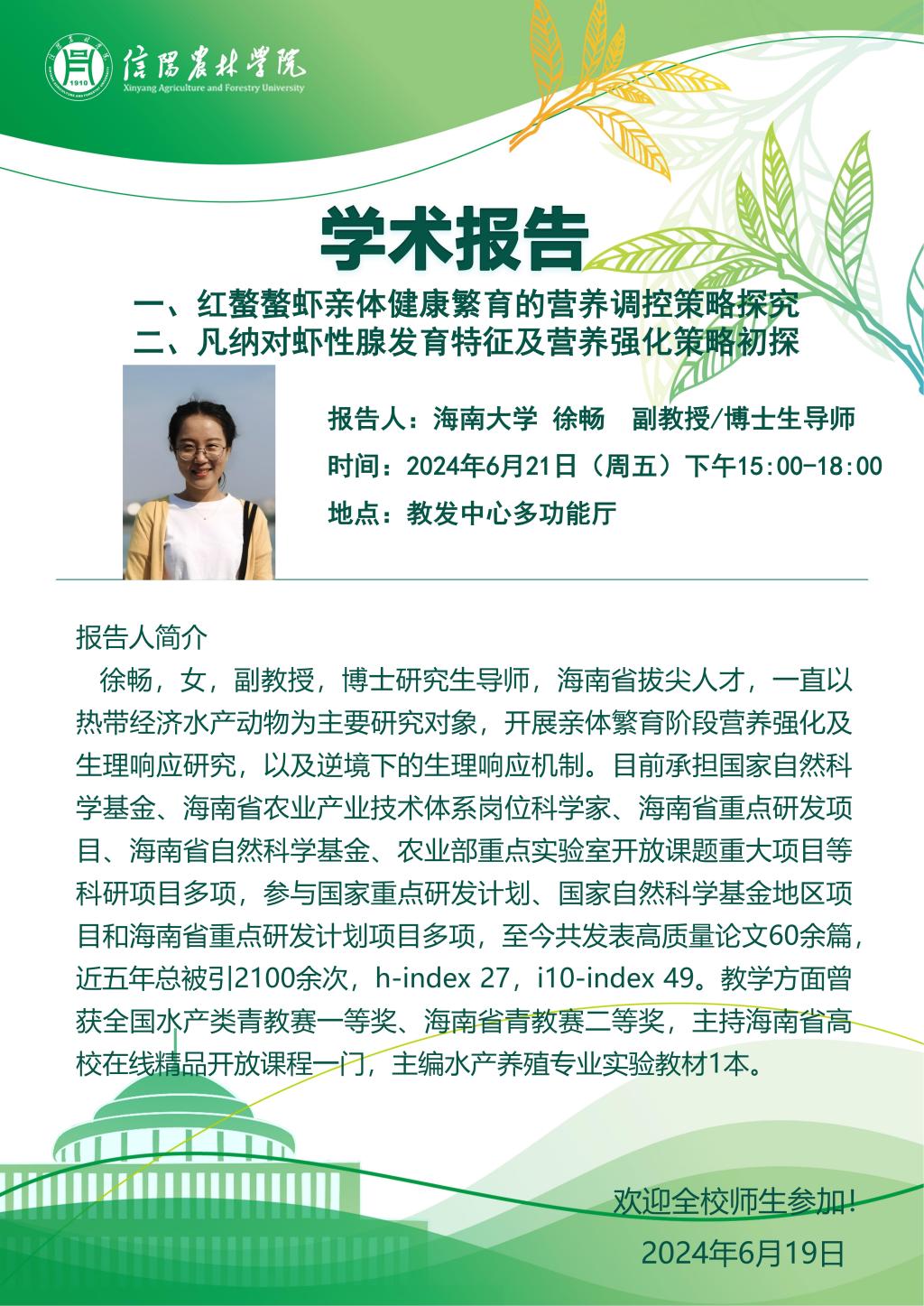 学术报告——红鳌鳌虾亲体健康繁育的营养调控策略探究;凡纳对虾性腺发育特征及营养强化策略初探