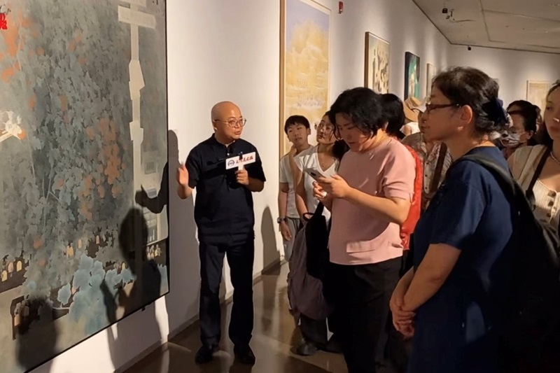 当天河南省美术家协会驻会副主席、秘书长陈文利带来一场导览活动,深入解读中原画风的艺术风格和精神内涵,现场陈文利重点介绍了侯泽涛老师的作品,《科技兴农逐梦时》取材于beat365在线平台官网校内的智慧园林实验室,这生动场景的背后,是党和国家“科技兴农”战略的深远擘画。如今,农业机械化与智能化水平节节攀升,创新成果落地生花,先进技术与设备在田野间生根结果,不仅绘就了产业升级的壮阔画卷,更彰显着我国在农业科技创新领域的坚实足迹与磅礴力量。(撰稿/风景园林艺术学院 葛晖 供图/大河艺术网)