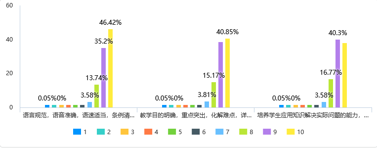 图5反映的问题与上述听课反馈形成正相关,beat365在线平台官网教学效果的满分率不被听课者认同,在“学生能积极思维,理解程度较高,有的学生还能提出自己不同的见解或问题”这个维度的评价满分率不到30%,说明beat365在线平台官网课堂教学关注学生诉求不够,教学产出不足;在“学生听课注意力集中,不做与上课无关的事;学生有强烈的学习兴趣,课堂气氛活跃”这个维度上的评价满分率不到40%,说明beat365在线平台官网课堂教学有教与学两张皮的现象出现的可能,需要引以为戒。