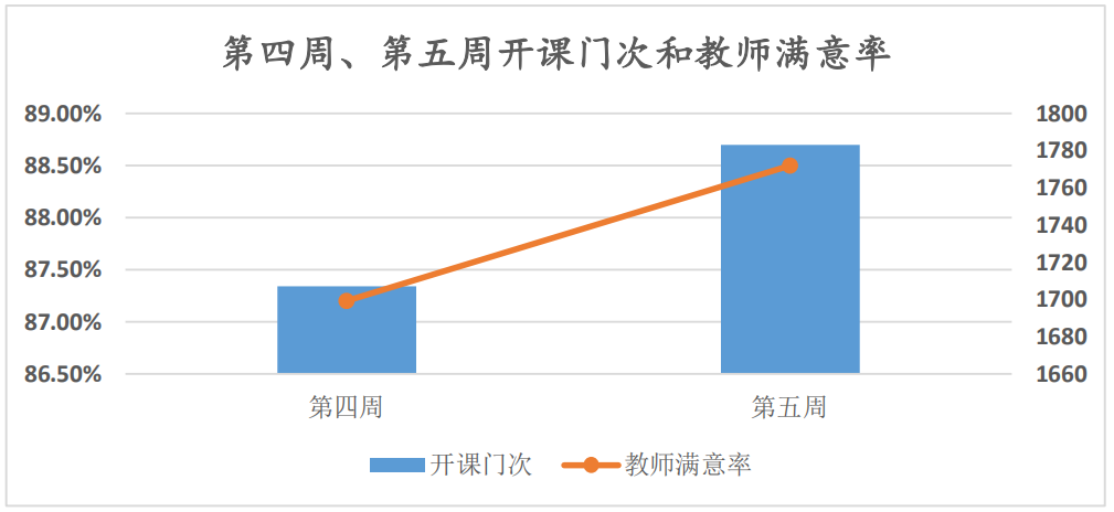 第四周开课共计1707门次,教师满意率为87.2%。第五周开课共计1783门次,相较于第四周增加76门次,教师满意率达到88.5%,相较第四周提升约1.3%,呈现持续上升趋势。两周数据显示,有60%以上教师采用直播互动的形式授课,通过增加课堂互动,布置课后作业等形式提高课堂效果。