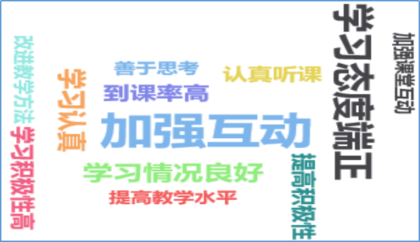 从本学期提交的教学建议中发现,大部分教师希望提升课堂互动率,希望学生能更多的参与到课堂中。提高互动率需要教师和学生共同努力,不仅需要教师改进授课方法,优化教学设计,增加课堂授课的技巧,还需要学生能够在课堂中发挥积极主动性。建议教师关注监评中心微信公众号,通过参加教学示范观摩课或者观看观摩课教师视频学习各教学单位优秀教师的教学方法;其次,授课教师也应自觉在线上线下,多学多练多磨课,通过在不同级别教学技能竞赛中锻炼提升。
